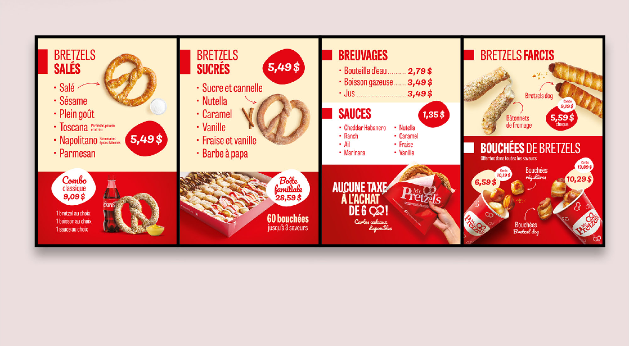 Mr. Pretzels looked to Voyou Bouffe’s expertise in packaging design and agri-food marketing to create packaging for its new products for retail sale in Costco and grocery stores. We also updated its in-store menus.